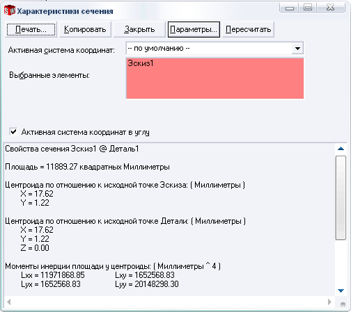 При виклику діалогового вікна Section Properties (Властивості перетину) у центрі мас ескізу міститься значок тривимірної системи координат. Параметри перетину ескізу відображаються в діалоговому вікні.