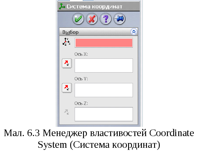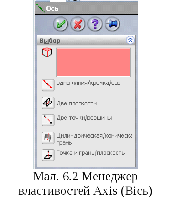 Інструмент Reference Axis (Довідкова вісь) використовується для створення довідкових і допоміжних осей. Ці осі являють собою параметричні лінії, що проходять через модель, елемент або довідковий об'єкт. Довідкові осі використовуються для створення довідкових площин, систем координат, кругових масивів, а також для створення сполучень у зборках. Вони також служать орієнтирами при побудові ескізів і створенні елементів. Довідкові осі відображаються як на моделі, так й у дереві конструювання Feature Manager. Коли ви натискаєте кнопку Axis (Вісь), відкривається менеджер властивостей, показаний на мал. 6.2.