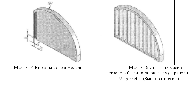 Можна створювати масиви, у яких форма й розмір кожного екземпляра буде визначатися взаємозв'язками й розмірами ескізу даного елемента. У цьому типі масиву роль напрямної грає один з розмірів ескізу вихідного елемента. Розмір, обраний у якості напрямної, управляє формою та розміром ескізу вихідного елемента. На мал. 7.14 показаний виріз, створений на основі моделі. На мал. 7.15 зображений лінійний масив зі змінюваним ескізом, створений на базі цього вирізу.