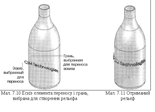 Ви помітите, що за замовчуванням перемикач сувою Wrap Parameters (Параметри переносу) установлений у положення Emboss (Штампування). У цьому випадку на поверхні моделі створюється опуклий рельєф. Виділіть грань, на якій потрібно створити рельєф. У графічній області буде показаний попередній вид елемента переносу, створеного з параметрами за замовчуванням. Задайте товщину за допомогою лічильника Thickness (Товщина). Клацніть на кнопці ОК у менеджері властивостей Wrap (Перенос). Ескіз елемента переносу й грань, обрана для створення рельєфу, показані на мал. 7.10. На мал. 7.11 показаний отриманий рельєф.