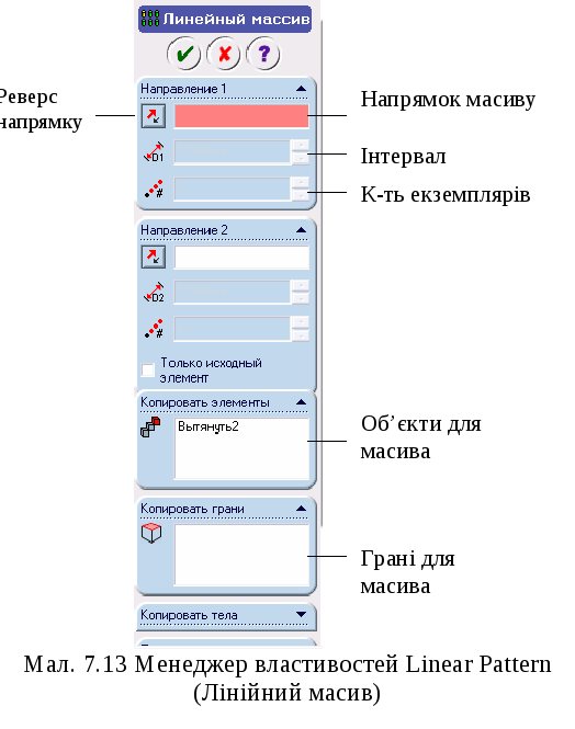 Щоб створити лінійний масив, клацніть на кнопці Linear Pattern (Лінійний масив) на панелі інструментів Features (Елементи) або виберіть у меню команду Insert > Pattern > Linear Pattern (Вставка > Масив > Лінійний масив). Відкриється менеджер властивостей Linear Pattern (Лінійний масив) і з'явиться область підтвердження. Частина менеджера властивостей Linear Pattern (Лінійний масив) показана на мал. 7.13.