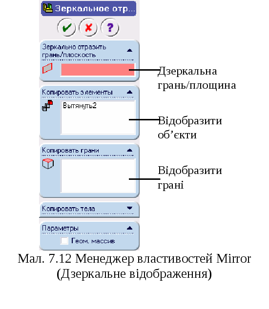 Інструмент Mirror (Дзеркальне відображення) служить для симетричного копіювання виділеного елемента, грані або тіла щодо заданої площини, названої дзеркальною площиною. Роль дзеркальної площини може грати довідкова площина або плоска грань. Щоб скористатися цим інструментом, клацніть на кнопці Mirror (Дзеркальне відображення) на панелі інструментів Features (Елементи) або виберіть у меню команду Insert > Pattern/Mirror > Mirror (Вставка > Масив/Дзеркало > Дзеркальне відображення). Відкриється менеджер властивостей Mirror (Дзеркальне відображення) (Мал. 7.12).
