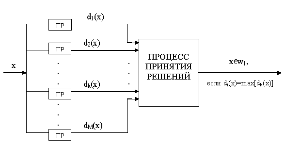 Третя задача, пов'язана з побудовою систем розпізнавання образів, полягає у відшуканні оптимальних вирішальних процедур, необхідних при ідентифікації і класифікації. Після того, як дані, зібрані про належні розпізнаванню образи, представлені крапками або векторами вимірювань в просторі образів, надамо машині з'ясувати, якому класу образів ці дані відповідають. Хай машина призначена для розрізнення M класів, позначених w1, w2 ... ..., wm B такому випадку простір образів можна вважати таким, що складається з M областей, кожна з яких містить крапки, відповідні образам з одного класу. При цьому задача розпізнавання може розглядатися як побудова меж областей рішень, розділяючих M класів, виходячи із зареєстрованих векторів вимірювань. Хай ці межі визначені, наприклад, вирішальними функціями d1(х),d2(x)..., dm(х). Ці функції, звані також дискримінантними функціями, є скалярними і однозначними функціями образу х. Якщо di (х) > dj (х) для всіх _, j= 1, 2 ..., M, j ? _, то образ х належить класу w1. Іншими словами, якщо i-я вирішальна функція di(x) має найбільше значення, то X_WI. Змістовною ілюстрацією подібної схеми автоматичної класифікації, заснованої на реалізації процесу ухвалення рішення, служить приведена на мал. 2.3 блоксхема (на схемі ГРФ означає "генератор вирішальних функцій").