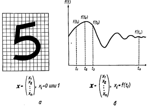 Другий приклад проілюстрований на мал. 2.1,6. B цьому випадку чинами служать безперервні функції (типу звукових сигналів) змінної t. Якщо вимірювання значень функцій проводиться в дискретних точках t1,t2 ..., tn, вектор образу можна сформувати, прийнявши x1= f(t1),x2=f(t2)..., xn = f(tn).