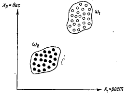 Вектори образів містять всю інформацію, що піддається вимірюванню, про образи. Процес вимірювання, якому піддаються об'єкти певного класу образів, можна розглядати як процес кодування, що полягає в привласненні кожній характеристиці образу символу з безлічі елементів алфавіту {xi}. Коли вимірювання приводять до інформації, представленої дійсними числами, часто виявляється корисним розглядати вектори образів як точки n-мірного евклидова простору. Безліч образів, що належать одному класу, відповідає сукупності крапок, розсіяних в деякій області простору вимірювань. Відповідний простий приклад приведений на мал. 2.2 для випадку двох класів, позначених w1 і w2. B цьому прикладі передбачається, що класи w1 і w2 представляють відповідно групи футболістів професіоналів і жокеїв. Кожний "образ" характеризується результатами двох вимірювань: зростанням і вагою. Вектори образів мають, отже, вигляд X = (X1, X2)', де параметр х1 - зростання, а параметр х2 - вага. Кожний вектор образу можна вважати точкою двовимірного простору. Як випливає з мал. 2.2 ці два класи утворюють непересічні множини що пояснюється характером параметрів, що вимірювалися. B практичних ситуаціях, проте, далеко не завжди вдається вибрати вимірювані параметри так, щоб одержати строго непересічні множини. B частковості, якщо як критерії розбиття вибрано зростання і вагу, може спостерігатися істотне, перетин класів представляючих професійних футболістів і баскетболістів.