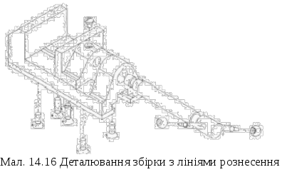 На екрані з'явиться діалогове вікно Drawing View Properties (Властивості креслярського виду), відкрите на вкладці View Properties (Властивості виду). Установіть прапорець Show in exploded state (Показати в рознесеному стані) в області Configuration information (Інформація про конфігурації) і клацніть на кнопці ОК у діалоговому вікні Drawing View Properties (Властивості креслярського виду). Креслення деталювання збірки з лініями рознесення показаний на мал. 14.16.