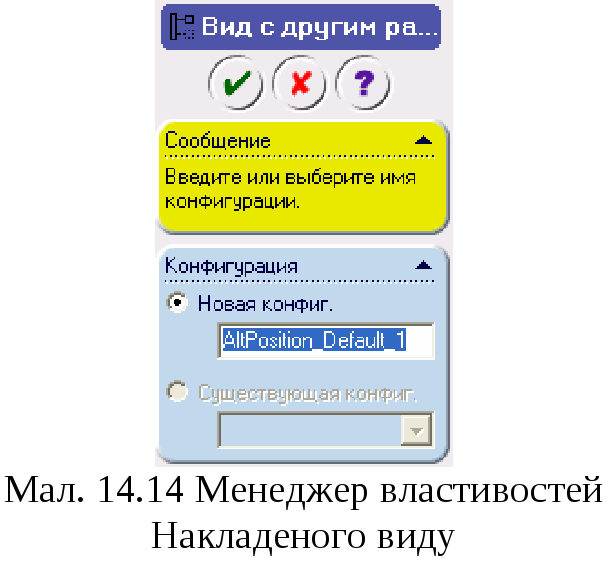 Для створення накладеного виду спочатку необхідно активізувати і вибрати креслярський вид збірки, по якому вам потрібно створити накладений вид. Клацніть на кнопці Alternate Position View (Накладений вид) у менеджері команд. На екрані відобразиться менеджер властивостей Alternate Position (Накладений вид), як показано на мал. 14.14. Вам буде запропоновано вибрати нову конфігурацію.