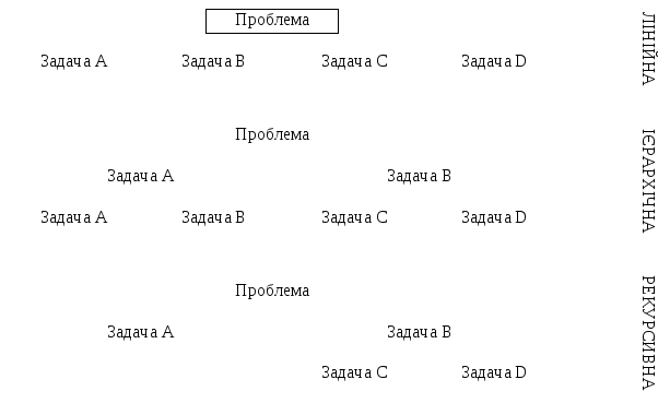 При розв’язуванні структурованих проблем можна вирішувати спочатку менш складні. Най поширені типи проблем: лінійна, ієрархічна, рекурсивна. Лінійна поділяється на задачі, які розв’язуються послідовно одна за одною. Ієрархічна має вигляд дерева (кількість гілок, що входять у кожну вершину, дорівнює кількості підзадач у даній задачі). Рекурсивна застосовує повернення до раніше розв’язаних задач. Існують також задачі, які погано структуруються.