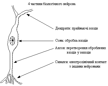 Базовим елементом мозку людини є специфічні клітини-нейрони, що здатні запам'ятовувати, думати і застосовувати попередній досвід до кожної дії. Нейрон складається з тіла клітини - соми, і двох типів зовнішніх деревоподібних відгалужень: аксона і дендритів. Тіло клітини вміщує ядро, що містить інформацію про властивості нейрону, і плазму, яка продукує необхідні для нейрону матеріали. Нейрон отримує імпульси від інших нейронів через дендрити (приймачі) і передає сигнали, згенеровані тілом клітки, вздовж аксона (передавач), що наприкінці розгалужується на волокна. На закінченнях волокон знаходяться синапси. Синапс є функціональним вузлом між двома нейронами (волокно аксона одного нейрона і дендрит іншого). Кора головного мозку містить близько 1011 нейронів, кожен з яких зв'язаний з 103 - 104 іншими, це приблизно від 1014 до 1015 взаємозв'язків.
