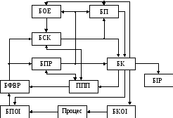 Робота системи в режимі навчання регламентується програмно блоком керування (БК), який при кожному випробуванні видає команду на блок кінцевої обробки інформації (БКОІ) для вироблення ініціюючої дії на виконавчі органи. Блок первинної обробки інформації (БПОІ) перетворює інформацію про функціональний стан процесу керування до вигляду, зручного для подальшого оброблення ЕОМ, і передає її у блок формування векторів розпізнавання (БФВР), що є автоматом допускового контролю. Із пристрою постійної пам’яті (ППП) у БФВР за командами БК надходять значення контрольних допусків на ознаки розпізнавання, які порівнюються із виміряними значеннями відповідних ознак. У результаті кожного випробування на виході БФВР формується структурований випадковий двійковий вектор-реалізація образу, координати якого є предикатами, що набувають значення "1", якщо значення відповідної ознаки знаходиться в полі контрольних допусків, і "0", якщо не знаходиться.