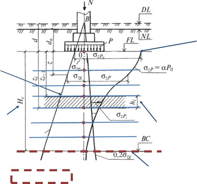 Для більшості випадків при фундаментах неглибокого закладання (стрічкових, стовпчастих, плитних для розрахунку осідання основи можна використовувати розрахункову схему у вигляді лінійно-деформованого напівпростору з умовним обмеженням глибини стисливої зони Нс. Цей метод розрахунку S звичайно називають методом пошарового підсумування.