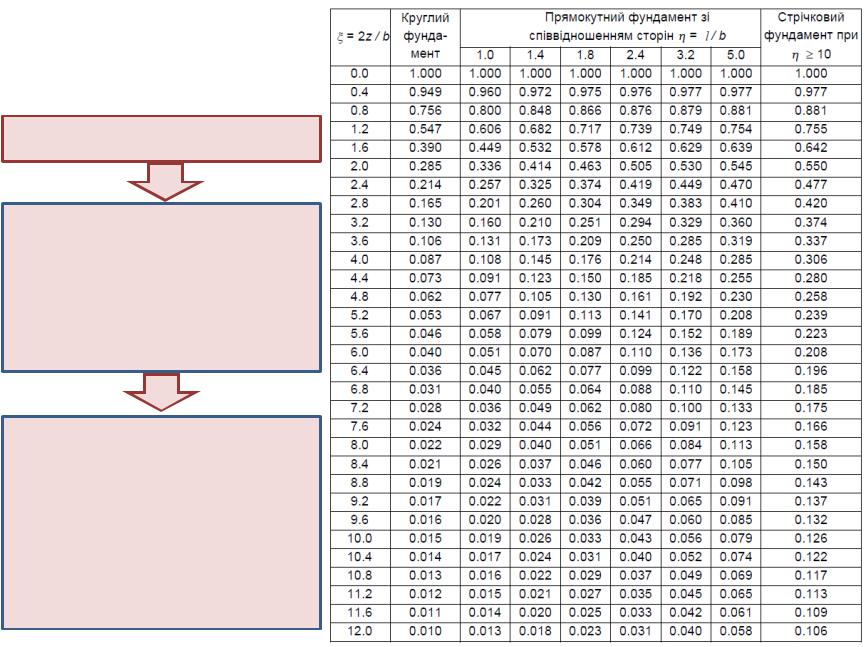 Таблиця коефіцієнтів до визначення осідання методом пошарового підсумування