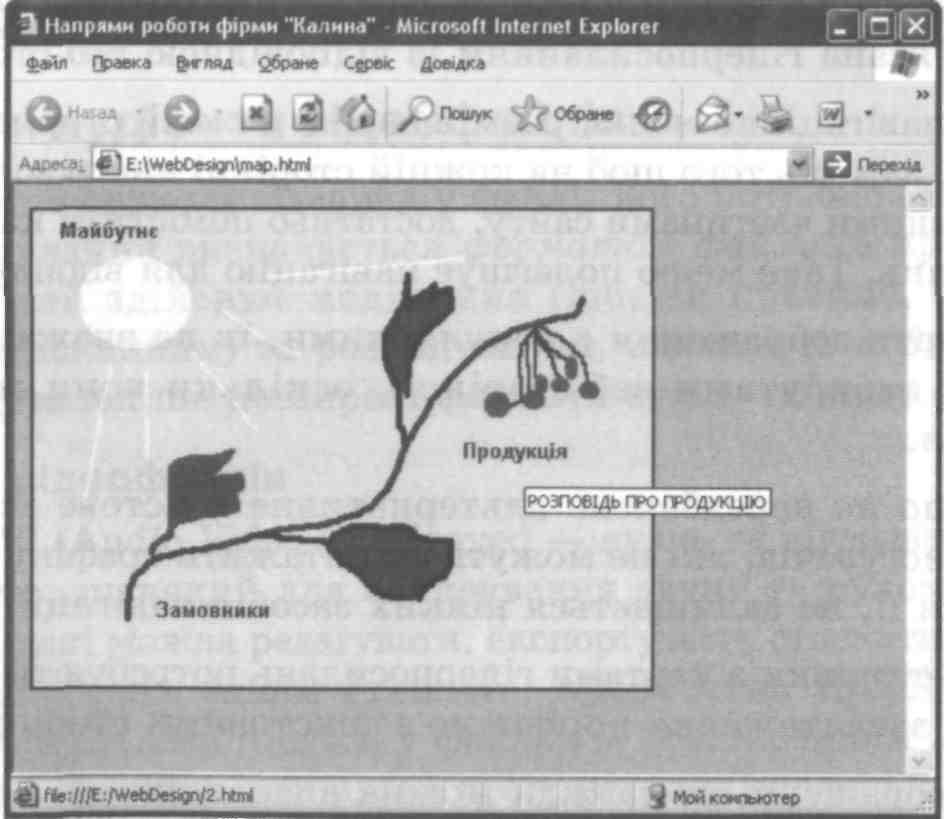 Якщо розмістити його між тегами <IMG> та <МАР>, то на веб-сторінці під картою посилань відобразиться напис «Виберіть на малюнку напрям роботи фірми». Провівши мишею над малюн-ком, можна виявити, що над гарячими областями вказівник миші змінює свій вигляд, як над звичайними посиланнями. Якщо ж зупинити його над гарячою областю, побачите спливаючий на-пис — результат дії атрибута ALT у тегу <AREA>.