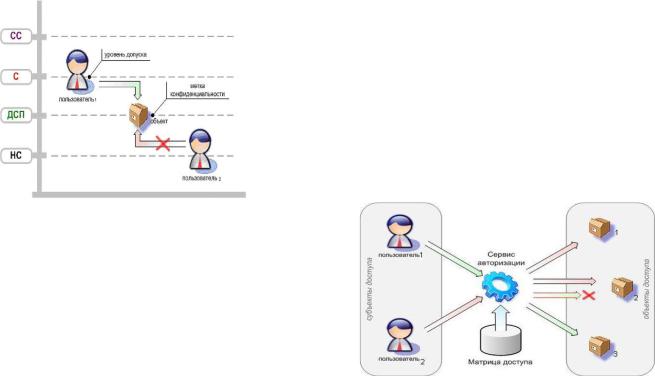 що має, «нетаємно», не може дістати доступ до об'єкту, що має мітку «для службового користування». В той же час, суб'єкт «Користувач «№1» з допуском рівня «таємно», право доступу до об'єкту з міткою «для службового користування» має.