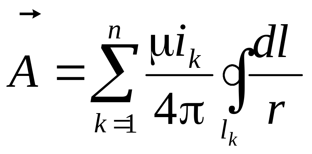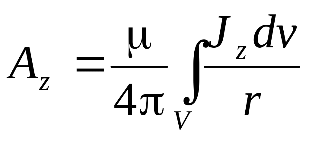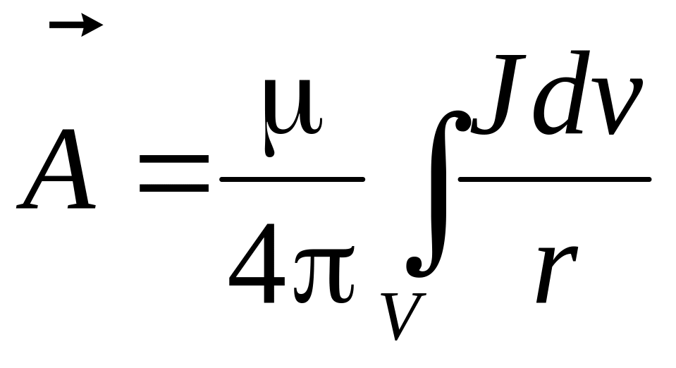 Полученные соотношения пригодны для определения векторного потенциала (его проекций) по заданному распределению плотностей тока в пространстве, как в областях вне токов ( ), так и внутри проводников с токами ( ).