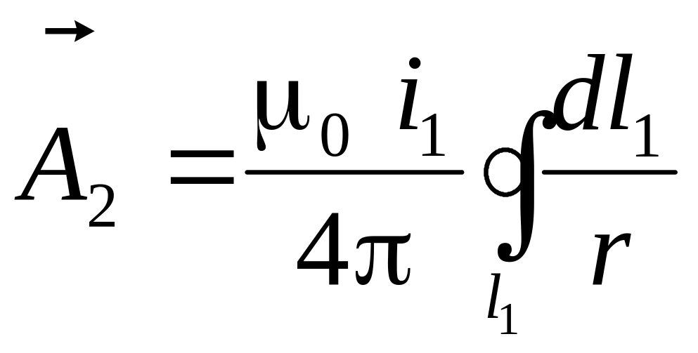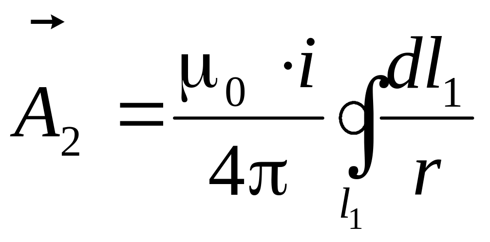 Определение взаимной индуктивности между тонкими контурами. Контур считается тонким, если поперечные размеры проводника намного меньше его длины. Рассмотрим два тонких контура (рис.9–4) и определим магнитный поток и потокосцепление второго контура от тока, протекающего в первом контуре, записав предварительно выражение для векторного магнитного потенциала, создаваемого этим током: