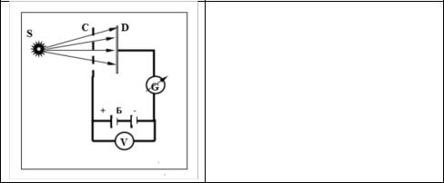 При освещении отрицательно заряженной пластины D светом от источника S в цепи возникал электрический ток, названный фототоком. Сила фототока была пропорциональна освещенности пластины D. Освещение положительно заряженной обкладки С не приводило к возникновению фототока. Тем самым было экспериментально доказано, что под действием света металл теряет отрицательно заряженные частицы. Измерение удельного заряда этих частиц по их отклонению в магнитном поле показало, что это – электроны.