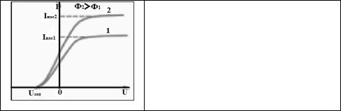 Из рисунка видно, что сила фототока, во-первых, прямо пропорциональна интенсивности падающего света (кривая 2 соответствует более высокой освещенности, чем в случае 1), а вовторых, при фиксированной