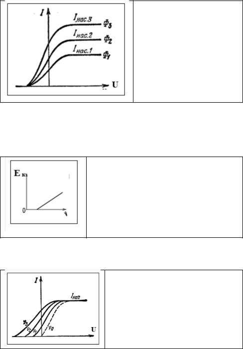 1.Количество электронов, вырываемых с поверхности металла в единицу времени, прямо пропорционально интенсивности светового потока Ф (количеству энергии, падающей со светом за единицу времени на единичную поверхность катода) и не зависит от частоты света.