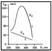 Кривая 2 – спектральная характеристика фототока, когда падающий свет поляризован и вектор Е совершает колебания перпендикулярно плоскости падения.