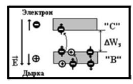 При внутреннем фотоэффекте в чистых полупроводниках при получении дополнительной энергии электроны переходят из валентной зоны «В» в зону проводимости «С» (8.8), поэтому увеличивается проводимость. В валентной зоне «В» образуется дырка, которую занимает электрон с более низких уровней валентной зоны, и т.д. Число электронов в зоне проводимости растет.