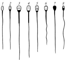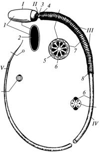 І — головка, ІІ — шийка, ІІІ — проміжна, IV — основна, V — кінцева частини хвоста; 1 — акросома; 2 — ядро; 3 — проксимальна центріоль; 4 — дистальна центріоль (краніальна частина); 5 — аксонема; 6 — мікрофібрили; 7 — мітохондріальна піхва; 8 — каудальна (кільцеподібна) частина дистальної центріолі