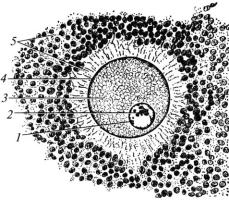 1 — ядро; 2 — ядерце; 3 — цитоплазма; 4 — первинна оболонка; 5 — вторинна оболонка