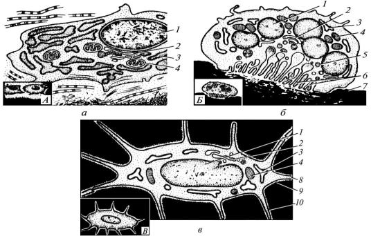 а — остеобласта; б — остеокласта; в — остеоцита (А, Б, В — те саме під світловим мікроскопом); 1 — ядро; 2 — комплекс Гольджі; 3 — гранулярна ендоплазматична сітка; 4 — мітохондрії; 5 — лізосома; 6 — гофрована облямівка; 7 — міжклітинна речовина; 8 — відростки; 9 — лакуна; 10 — каналець