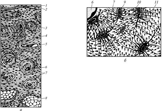 а — поперечний зріз; б — ділянка остеона; 1 — окістя; 2 — зовнішні оточуючі пластинки; 3 — остеон; 4 — вставні пластинки; 5 — циркуляторнопаралельні структури; 6 — канал остеона; 7 — кісткова пластинка; 8 — губчаста речовина; 9 — остеоцити в лакунах; 10 — відростки остеоцитів у канальцях; 11 — волокна