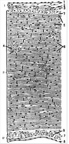 І – ендокард, ІІ – міокард, ІІІ – епікард, IV - осердя. 1 – ендотеліоцити; 2 – субепітеліальний шар; 3 – м’язово-еластичний шар; 4 – сполучнотканинний шар; 5 – атипові кардіоміоцити; 6 – типові кардіоміоцити; 7 – вставні диски; 8 – волокнинта сполучна тканина; 9 – мезотелій; 10 – власна пластинка; 11 – перикардіальна порожнина