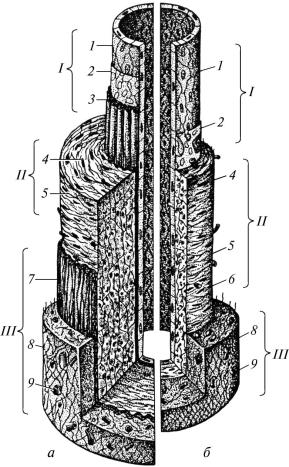 І – інтима: 1 – ендотелій; 2 – підендотеліальний шар; 3 – внутрішня еластична мембрана; ІІ – медіа: 4 – пучки гладких м’язових клітин; 5 – еластичні волокна; 6 – колагенові волокна; ІІІ – адвентиція: 7 – зовнішня еластична мембрана; 8 – сполучна тканина; 9 – судини судин