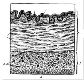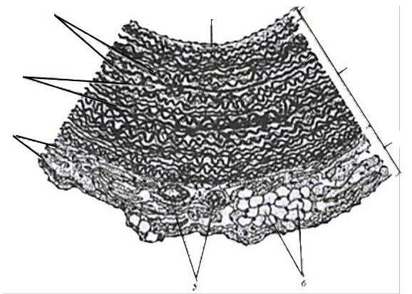 І – інтима, ІІ – медіа, ІІІ – адвентиція. 1 – ендотеліоцити; 2 – вікончасті еластичні мембрани; 3 – гладкі м’язові клітини; 4 – еластичні волокна; 5 – судини судин; 6 – адипоцити