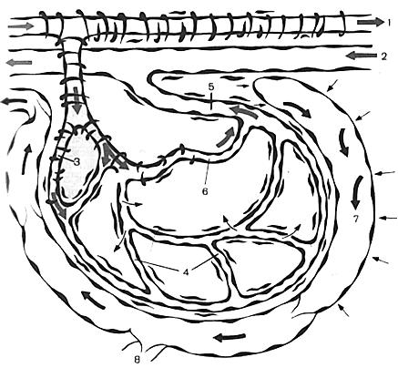 1 – артерія; 2 – вена; 3 – артеріоли; 4 – гемокапіляри; 5 – венули; 6 – артеріоловенулярний анастомоз; 7 – лімфатичний капіляр; 8 – лімфатичні судини. Товстими стрілками показано напрямки течії крові і лімфи, а тонкими – транскапілярний обмін