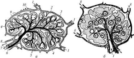 а – загальна схема; б – схема будови лімфатичного вузла свині; 1 – приносна лім-