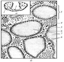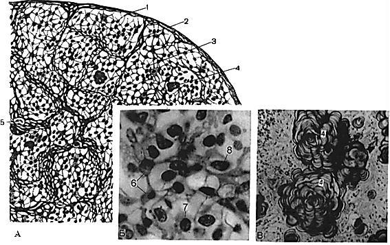 А – схема мікроструктури епіфіза, Б – паренхіма епіфіза, В – мозковий «пісок» в епіфізі; 1 – капсула; 2 – перегородки; 3 – паренхіма; 4 – мозковий «пісок»; 5 – кровоносні судини; 6 – гліоцити; 7 – темні пінеалоцити; 8 – світлі пінеалоцити