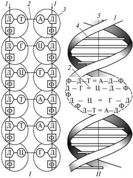 Молекула ДНК складається з двох спіральних ланцюгів, нуклеотиди яких сполучаються один з одним через азотисті основи (рис. 1). При цьому аденін сполучається тільки з тиміном, а гуанін – з цитозином. Такі зв’язки називають комплементарними.