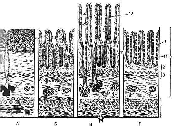 А – стравохід; Б – шлунок; В – тонка кишка; Г – товста кишка; І – слизова оболонка з підслизовою основою; ІІ – м’язова оболонка; ІІІ – серозна (адвентиційна) оболонка; 1 – епітелій слизової; 2 – власна пластинка слизової; 3 – м’язова пластинка слизової; 4 – келихоподібна клітина; 5 – залози у власній