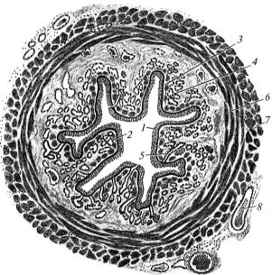 1 – епітелій; 2 – власна пластинка слизової оболонки; 3 – м’язова пластинка слизової оболонки; 4 – залози у підслизовій основі; 5 – протока залози; 6 – коловий, 7 – поздовжній шари м’язової оболонки; 8 – кровоносні судини в адвентиції