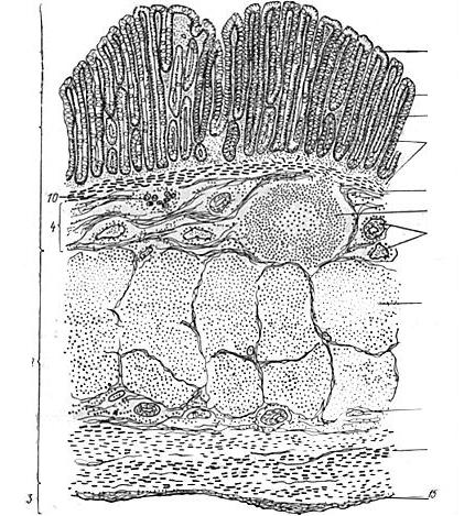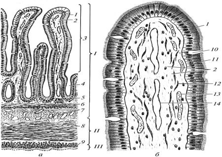 Рис. 67. Схема мікроскопічної будови стінки тонкої кишки (а)