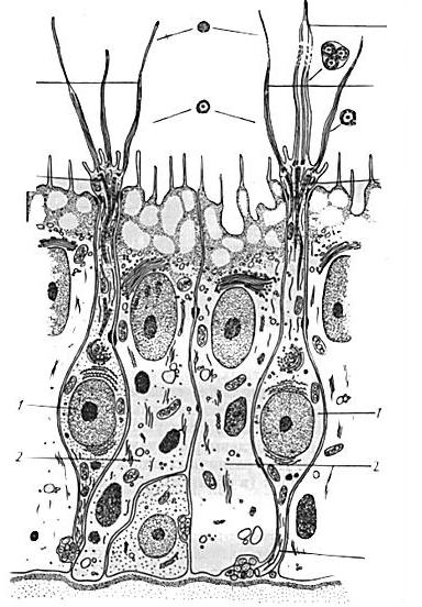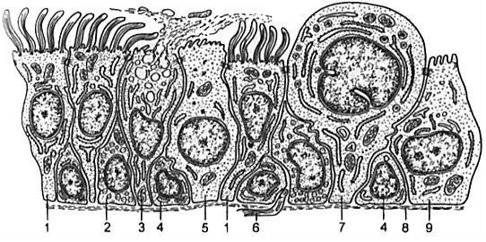 1 – війчасті клітини; 2 – ендокринні клітини; 3 – келихоподібні клітини; 4 – вставні клітини; 5 – безвійчасті клітини; 6 – нервове волокно; 7 – клітини Клара; 8 – базальна мембрана; 9 – хеморецепторна клітина