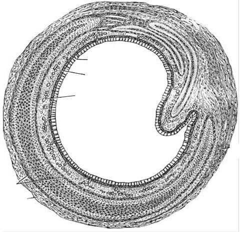 представлена епітелієм, власною пластинкою і підслизовою основою. Епітелій простий, багаторядний, війчастий. Його ендокриноцити продукують гормони та біогенні аміни (серотонін, норадреналін, дофамін), які регулюють скорочення гладкої м’язової тканини. Власна пластинка утворена пухкою волокнистою сполучною тканиною, яка багата на еластичні волокна, що орієнтовані вздовж органа. У власній пластинці трапляються скупчення лімфоїдної тканини. Підслизова основа, як і власна пластинка, утворена пухкою волокнистою сполучною тканиною. В ній містяться секреторні відділи серозно-слизових залоз,