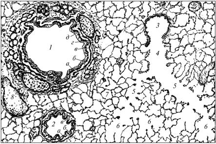 7 – альвеола; 8 – кровоносні судини; а – війчастий епітелій; б – власна пластинка слизової оболонки; в – м’язова пластинка слизової оболонки; г – підслизова основа з бронхіальними залозами; д – хрящова пластинка