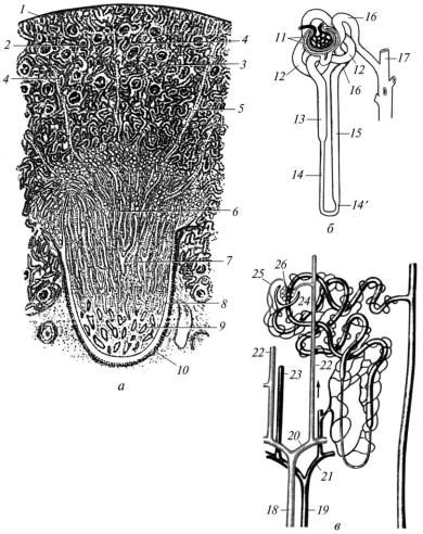 а – кіркова і мозкова речовина; б – нефрон; в – судини нирок; 1 – капсула нирки; 2 – кіркова речовина; 3 – ниркові тільця; 4 – проксимальний і дистальний відділи нефрона; 5 – мозкові промені; 6 – мозкова речовина; 7 – прямі ниркові канальці й збірні канальці; 8 – нирковий сосочок; 9 – отвори сосочкових проток; 10 – ниркова чаша; 11 – капсула клубочка; 12 – звивистий каналець проксимального відділу нефрона; 13 – прямий каналець проксимального відділу нефрона; 14 – низхідна частина тонкого канальця; 14 – висхідна частина тонкого канальця; 15 – прямий каналець дистального відділу нефрона; 16 – звивистий каналець дистального відділу нефрона; 17 – збірний каналець; 18 – міжчасткова артерія; 19 – міжчасткова вена; 20 – дугова артерія; 21 – дугова вена; 22 – променева артерія; 23 – променева вена; 24 – приносна артерія; 25 – виносна артеріола; 26 – судинний клубочок. Стрілкою показано напрямок течії крові в променевій артерії