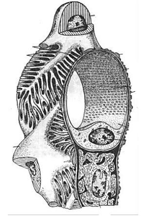 (рис. 76). У проксимальній і дистальній частинах каналець має звивисті і прямі ділянки, а в тонкій частині він прямий. Капсула оточує су-