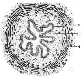 а – епітелій слизової оболонки; б – власна пластинка слизової оболонки; в – м’язова оболонка; г – адвентиція