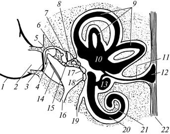 1 – частина вушної раковини; 2 – зовнішній слуховий хід; 3 – барабанна перетинка; 4 – барабанна порожнина; 5 – молоточок; 6 – коваделко; 7 – стремінцевий м’яз; 8 – стремінце; 9 – перетинчасті півколові канали; 10 – маточка; 11 – ендолімфатична протока і водопровід присінка; 12 – мішечок ендолімфатичної протоки; 13 – мішечок; 14 – напружувач барабанної перетинки; 15 – сочевицеподібна кісточка; 16 – слухова труба; 17 – мис (виступ); 18 – вікно завитки; 19 – водопровід завитки; 20 – перетинчаста протока завитки в кістковій завитці; 21 – купол завитки; 22 – тверда мозкова оболонка. Простір між перетинчастим лабіринтом (чорний колір) і стінками лабіринту заповнений перилімфою. Кісткові стінки заштриховано