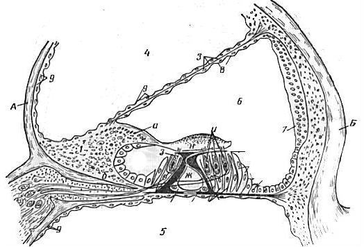 А – спіральна пластинка; 1 – лімб; а – вестибулярна губа; б – барабанна губа; в – спіральний жолоб; г – спіральний ганглій; Б – спіральна зв’язка; 2 – базилярна мембрана; 3 – присінкова мембрана; 4 – присінкові сходи; 5 – барабанні сходи; 6 – перетинчаста протока завитки; 7 – судинна смужка; 8 – простий плоский епітелій; 9 – ендотелій; В – спіральний орган; д – внутрішня клітина-стовп; е – зовнішня клітина-стовп; ж – тунель; з – внутрішня чутлива клітина; і – зовнішні чутливі клітини; к – зовнішня фалангові клітини; л – зовнішні пограничні клітини; м – зовнішні підтримувальні клітини; н – покривна мембрана
