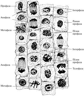 Рис. 9. Мітоз у клітинах корінця цибулі