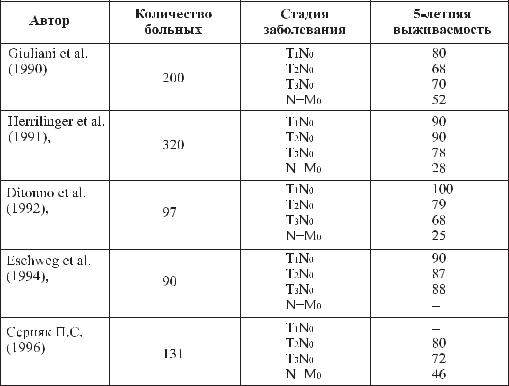 Результаты лечения РП представленные в литературе в значительной степени рознятся но, тем не менее, общие тенденции большинства исследователей очевидны. Giuliani et al. (1990), Herrilinger et al. (1991), Ditonno et al. (1992), Eschweg et al. (1994), Серняк П. С. (1996) приводят данные 5 летней выживаемости в зависимости от стадии заболевания.