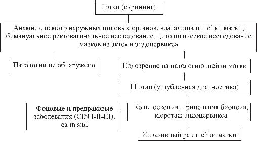 Профилактическое обследование включает: осмотр наружных половых органов, влагалища и шейки матки; бимануальное ректовагинальное исследование, исследование мазков из экто- и эндоцервикса. При выявлении фоновой патологии выполняется полибиопсия подозрительных участков шейки матки. Завершающий этап диагностики – выскабливание цервикального канала. Решающее значение в диагностике РШМ имеют инструментальные методы диагностики: а) кольпоскопия; б) цитологические методы; в) гистологические методы.